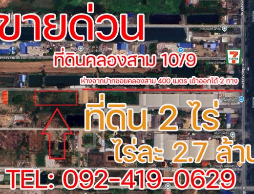 ขายด่วน! ที่ดินคลองสาม 10/9 คลองหลวง 2 ไร่ ราคาต่ำกว่าประเมิน ใกล้ถนนใหญ่เพียง 400 ม. โทร 092-4190629